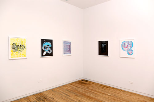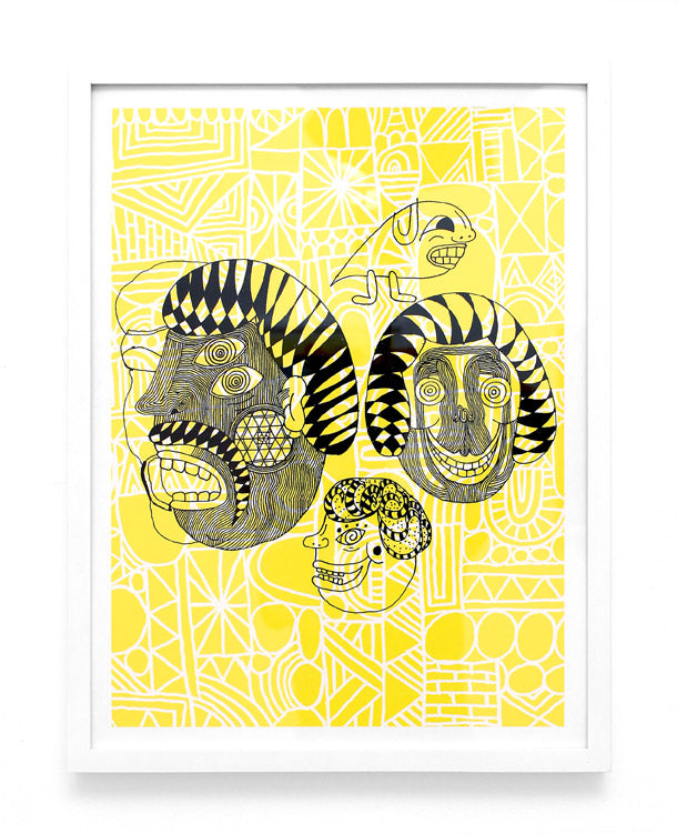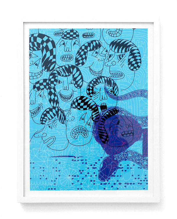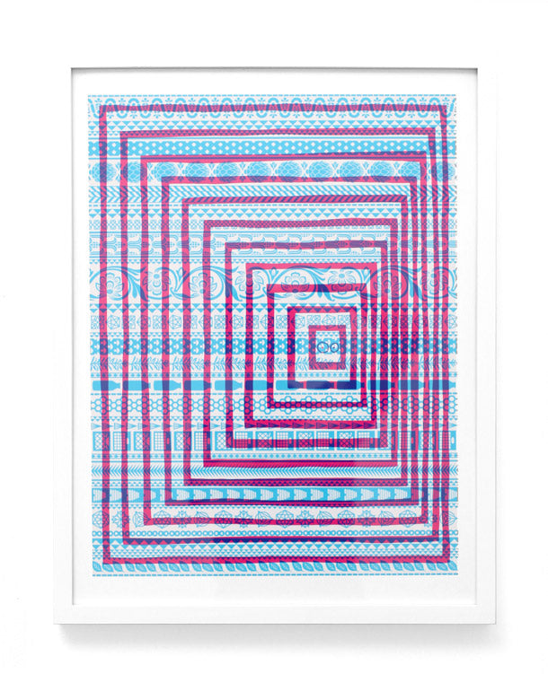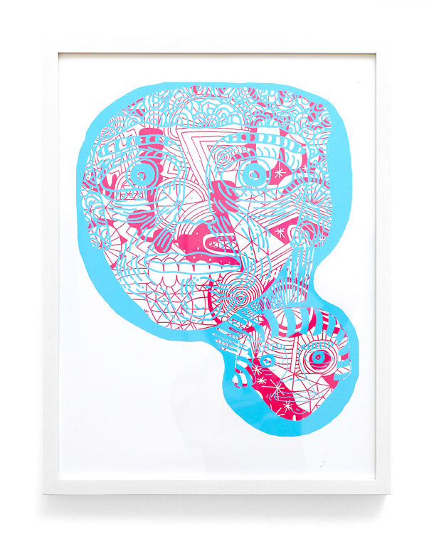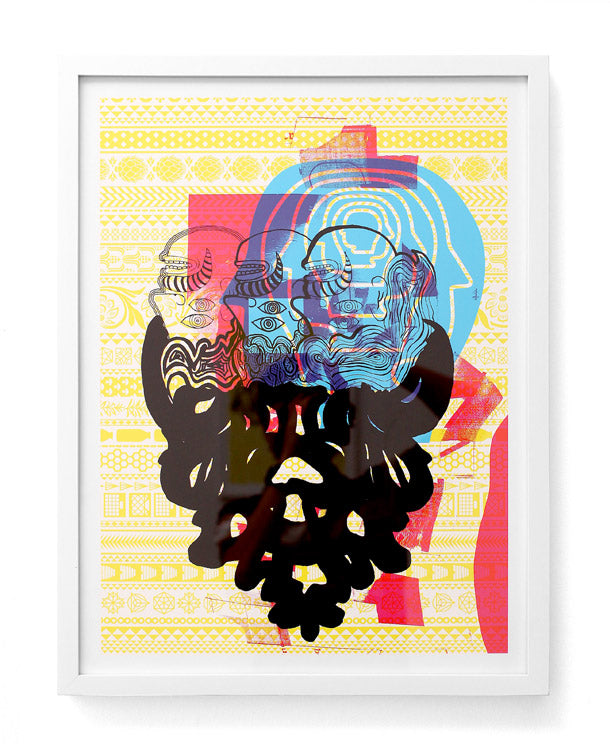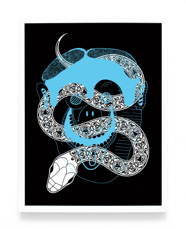 The music world reaps the rewards of Sonnenzimmer’s subtle, painterly gig posters while the apparel industry appropriates Mike Perry’s electric zine hallucinations into backpacks and Nike dunks. Both Dan Funderburgh and Seripop explore the limits of spatial adornment, Dan through the design of delicately intricate wallpaper that balances Moorish mosaic with American op art, and Seripop via enormous street poster collages, a medium they have evolved from their monstrous rock posters and describe as “the ‘skin’ of a city, growing and shedding organically”.