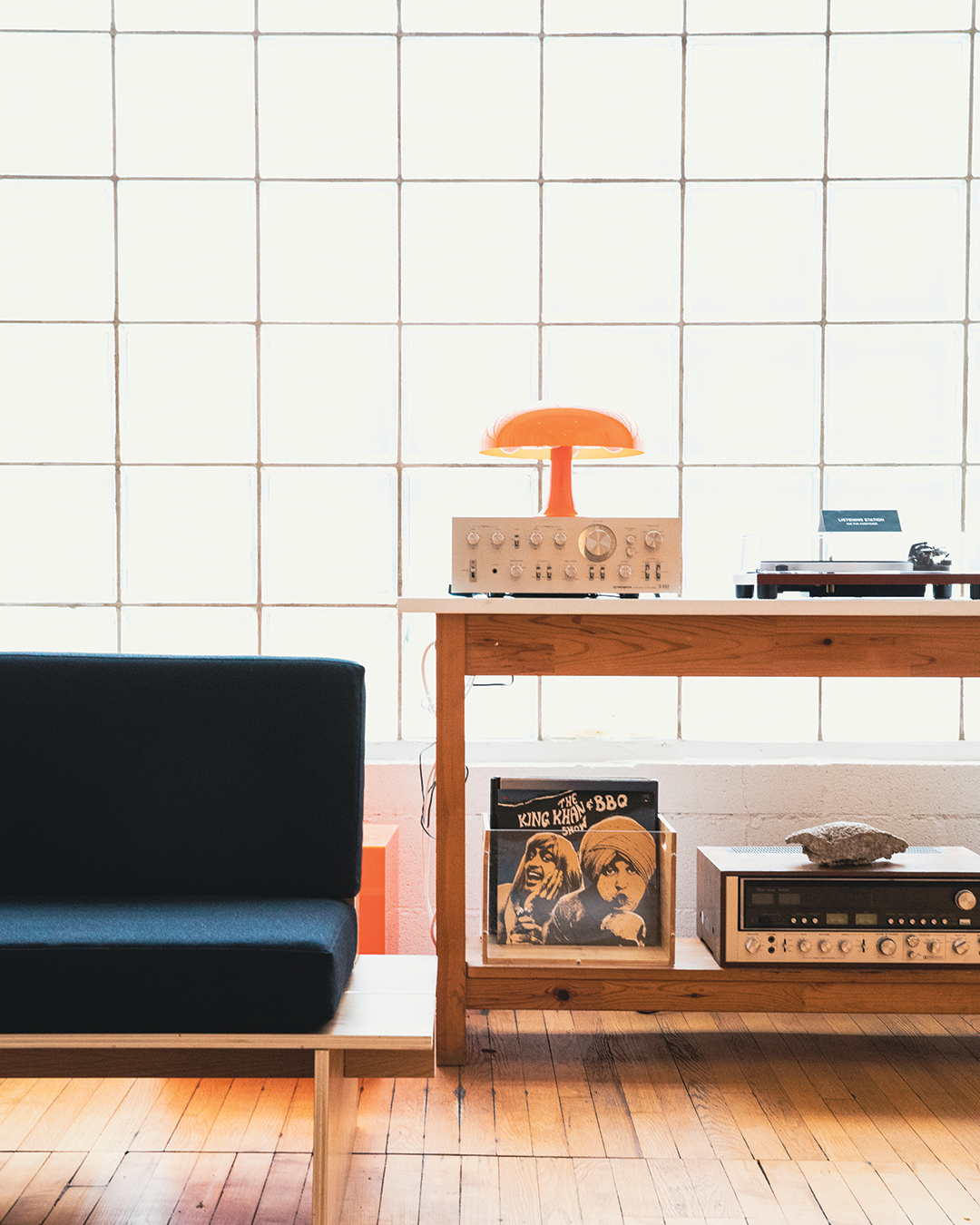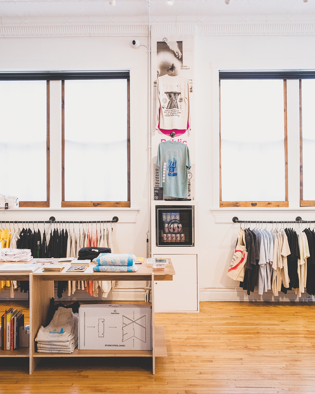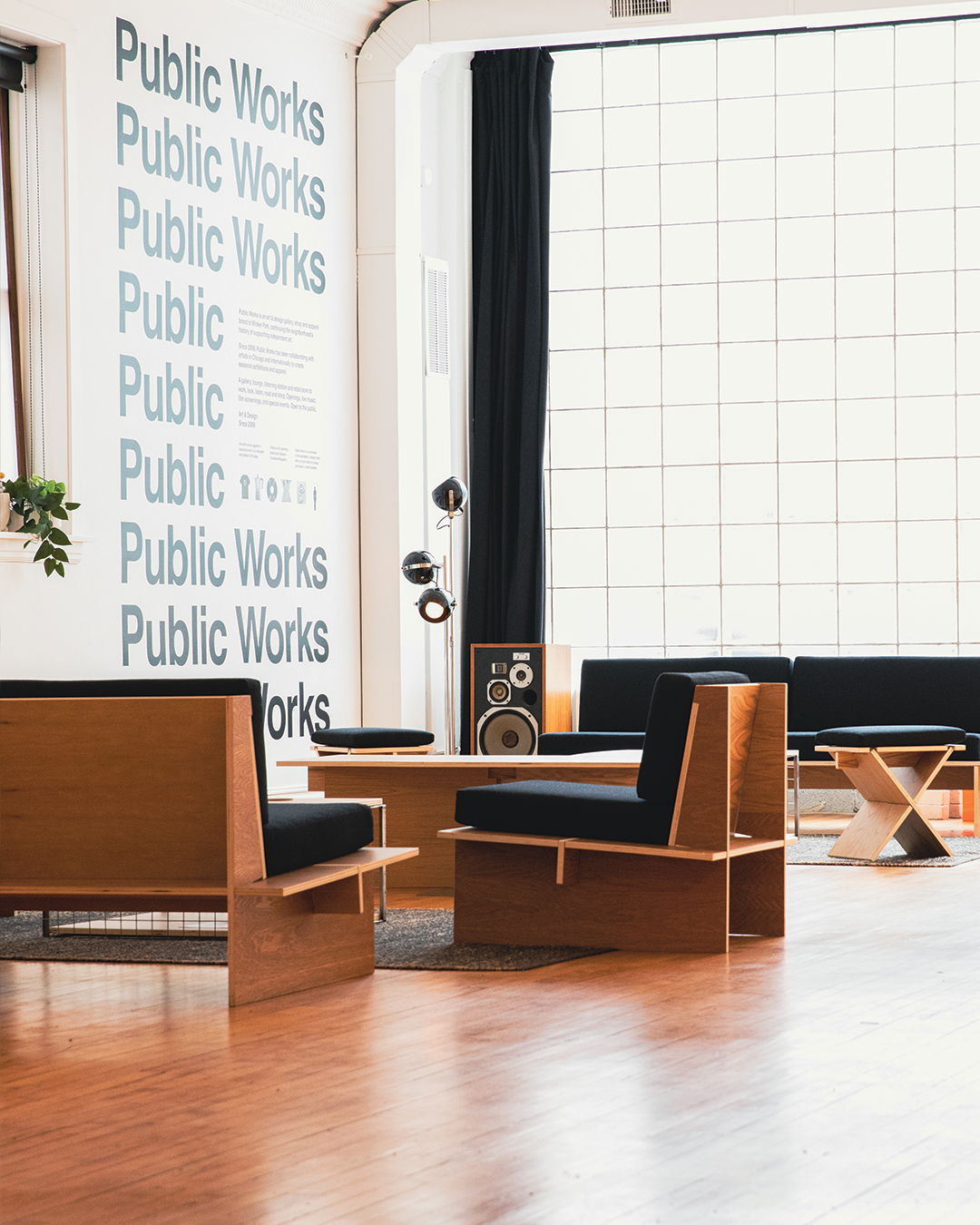 This isn't a traditional Public Works exhibition. This time we're shining a light on the space itself. We’ve built a new lounge into our retail space with custom furniture designed by Someoddpilot and crafted by Navillus Woodworks. Grab your own limited edition runs: we’ve created a custom sofa, lounge chair, stool, work table, coffee table, and bench designs, all available for purchase. Park it and read, work, and drink Dark Matter coffee or simply sit and enjoy our turntable listening station stocked with curated music. Shop new apparel and neighborhood collaborations, plus dig into ground breaking art & design work from our past 15 years of exhibitions.