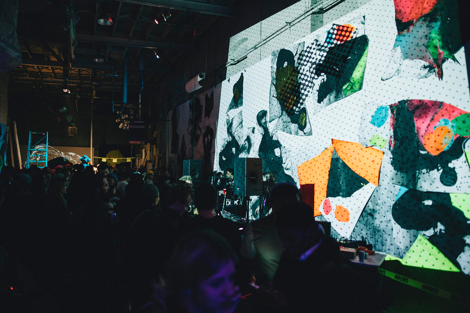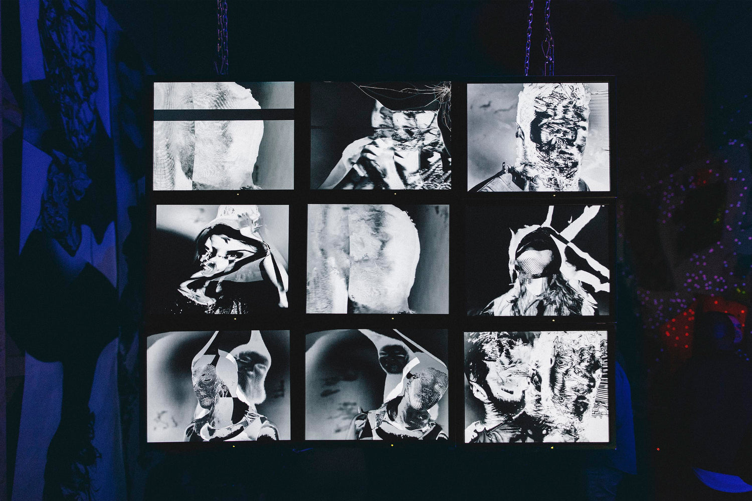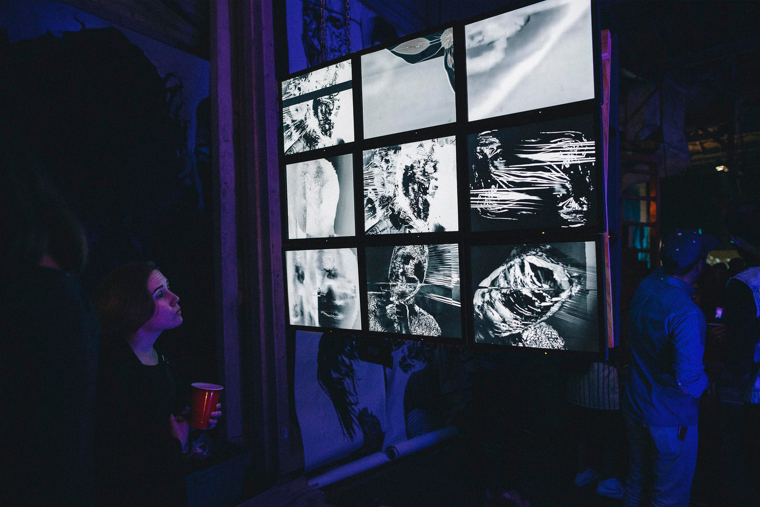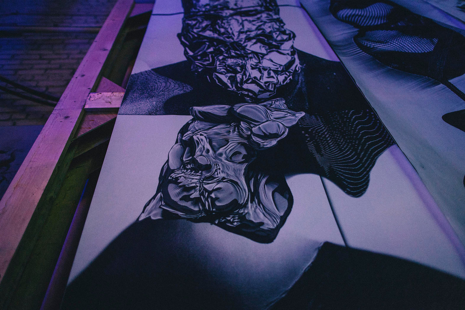 Public Works and parent company Someoddpilot play artist and sponsor roles simultaneously, bringing together an array of digital video works and giant, large scale printed banners into a daunting installation that leans heavily into analog and pre-digital effects, created by the design and AV team at Someoddpilot. The work, one installation amongs dozens elaborately constructed across the vast warehouse loft space, deconstructs and reconstructs identity, pulling at the boundaries of what is real, imagined and manipulated.