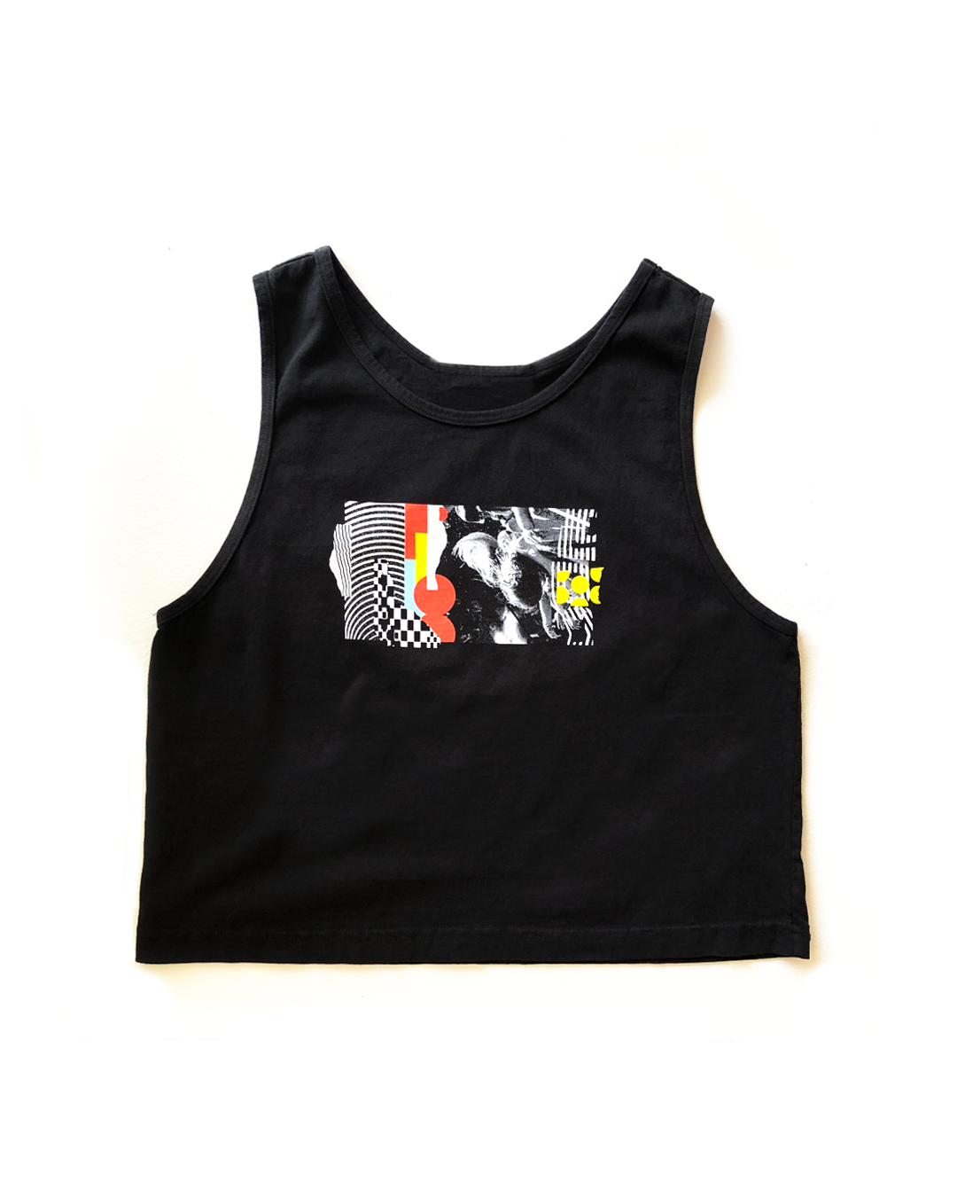 Black garment dyed, cotton unisex cropped tank with 4 color front graphic and inner woven tag.
