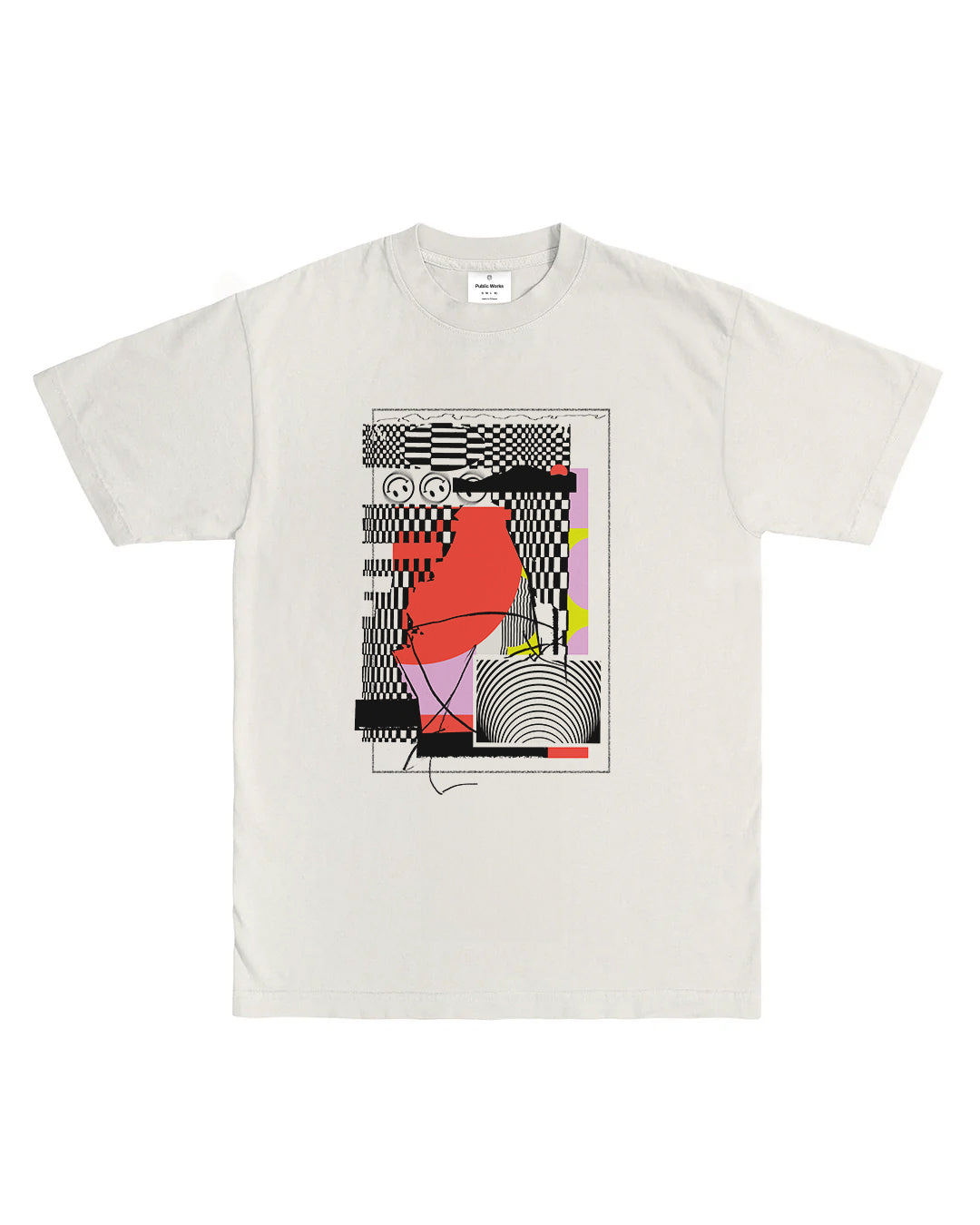 Cement, heavy cotton unisex t-shirt with multi-color front graphic and inner woven tag.