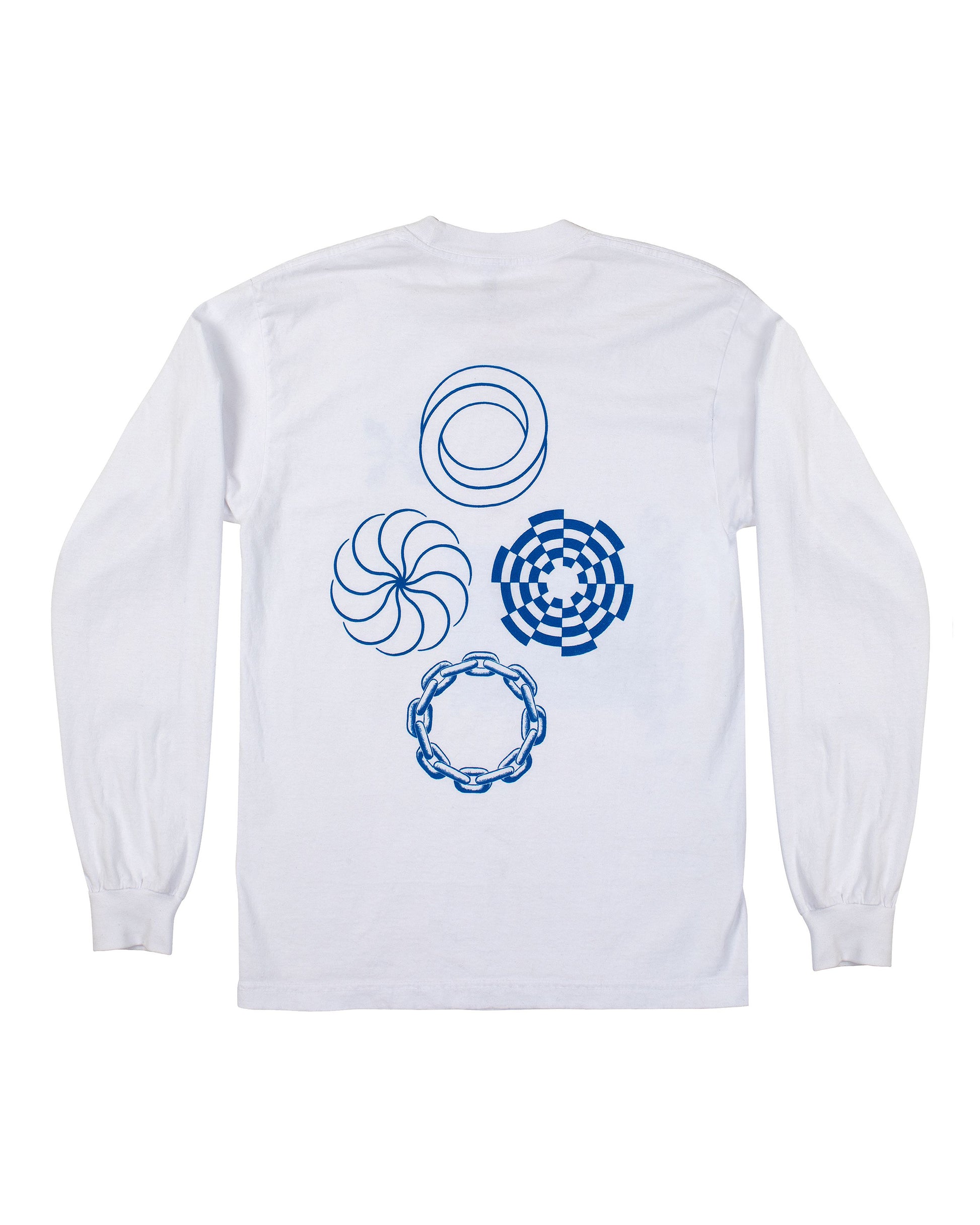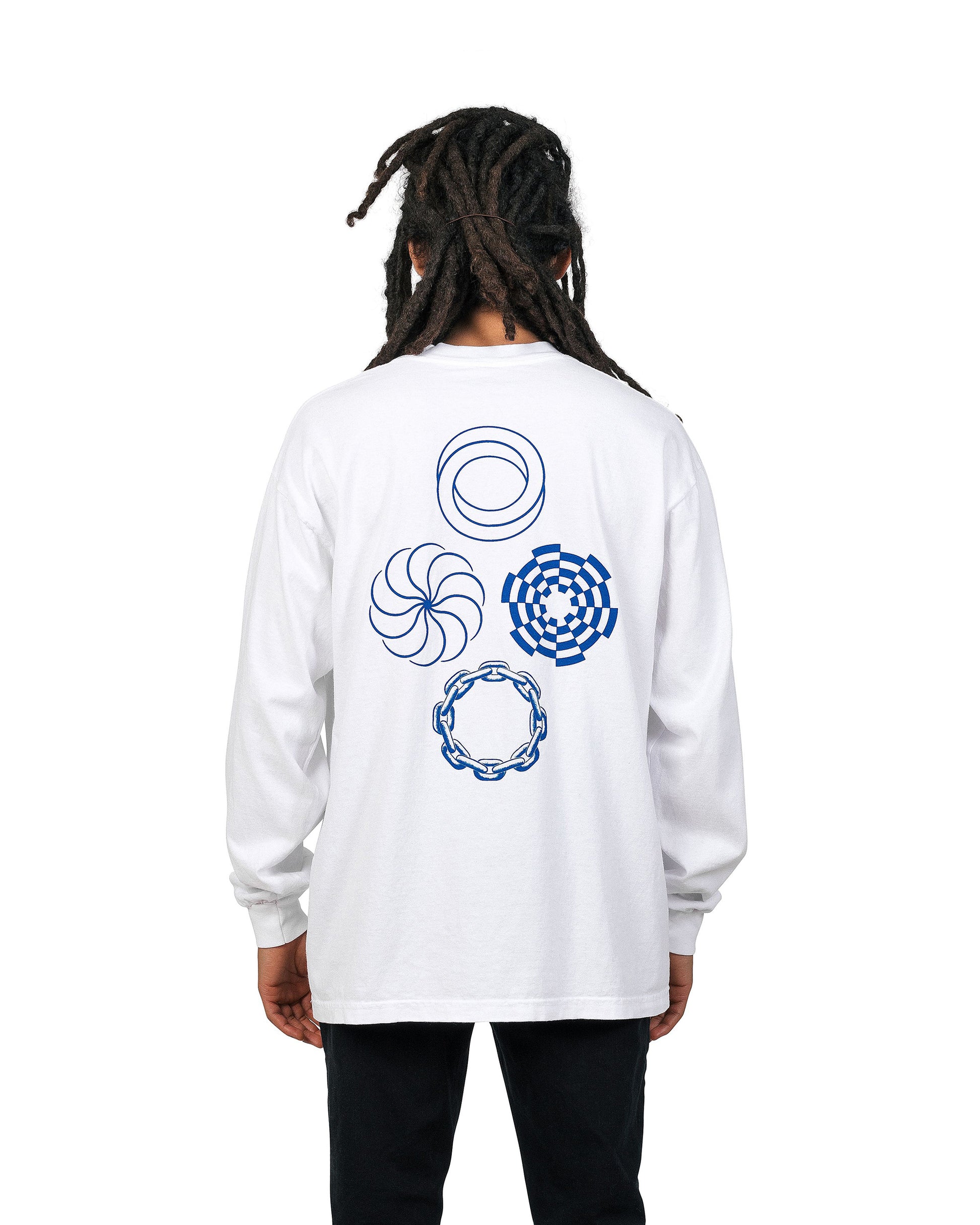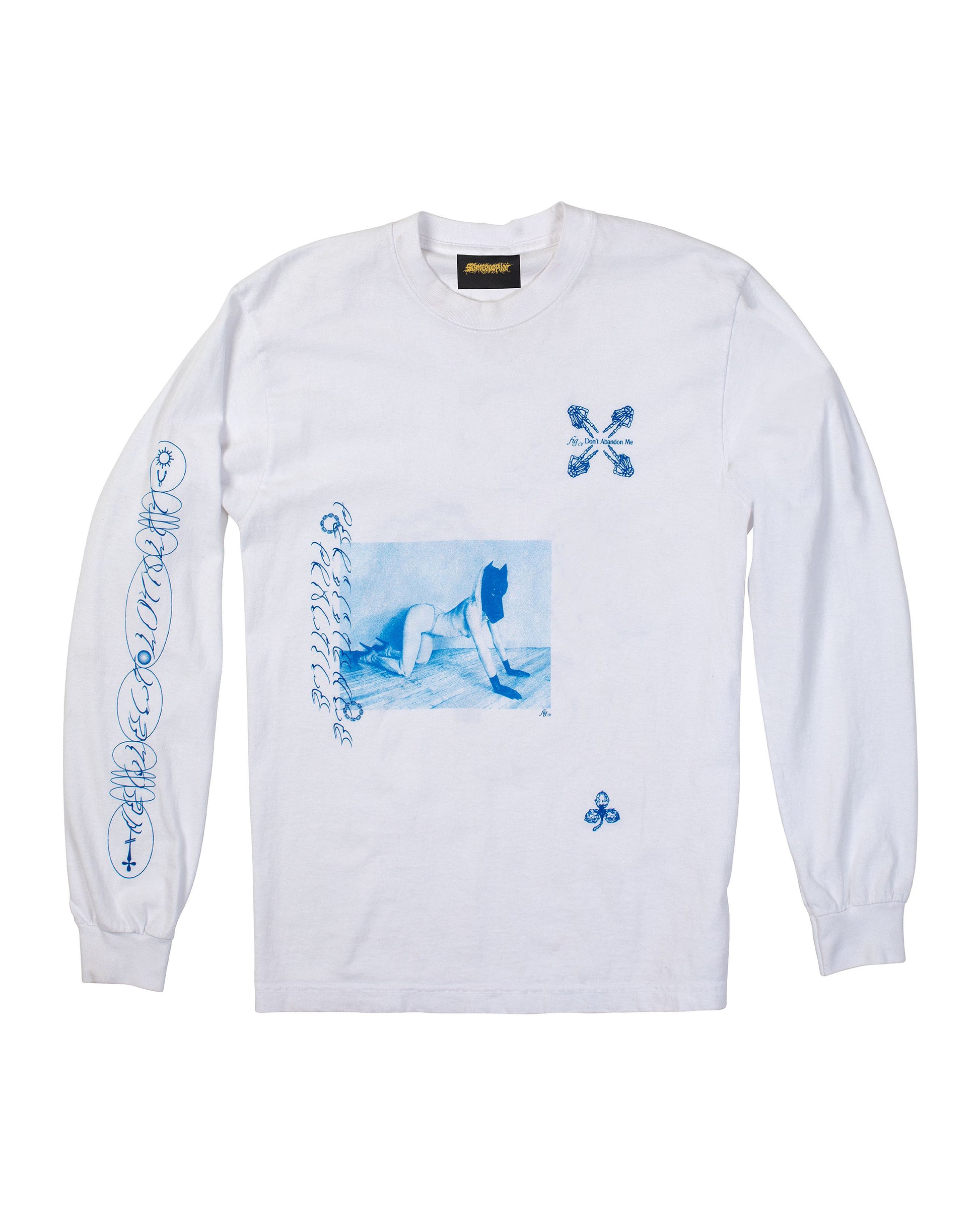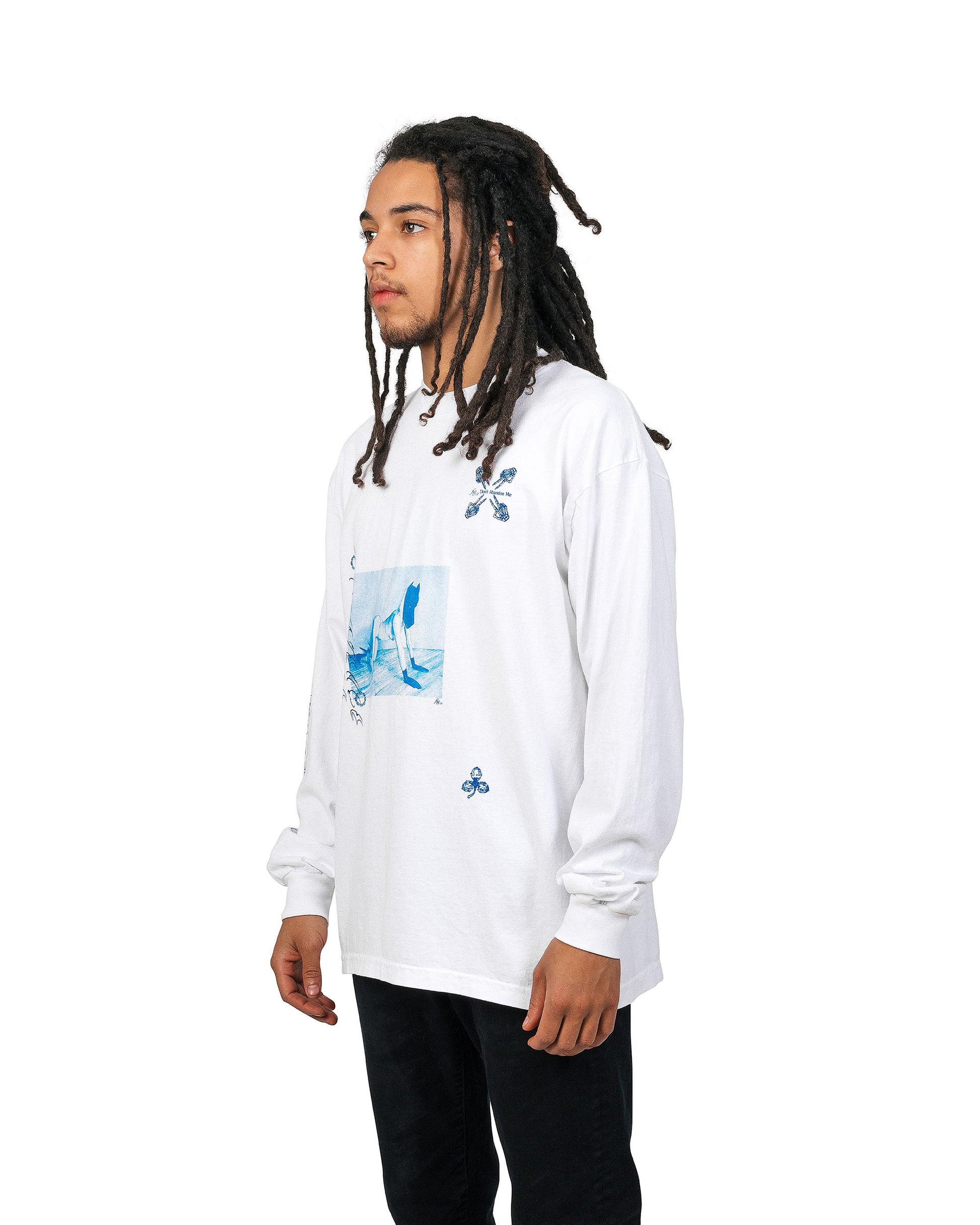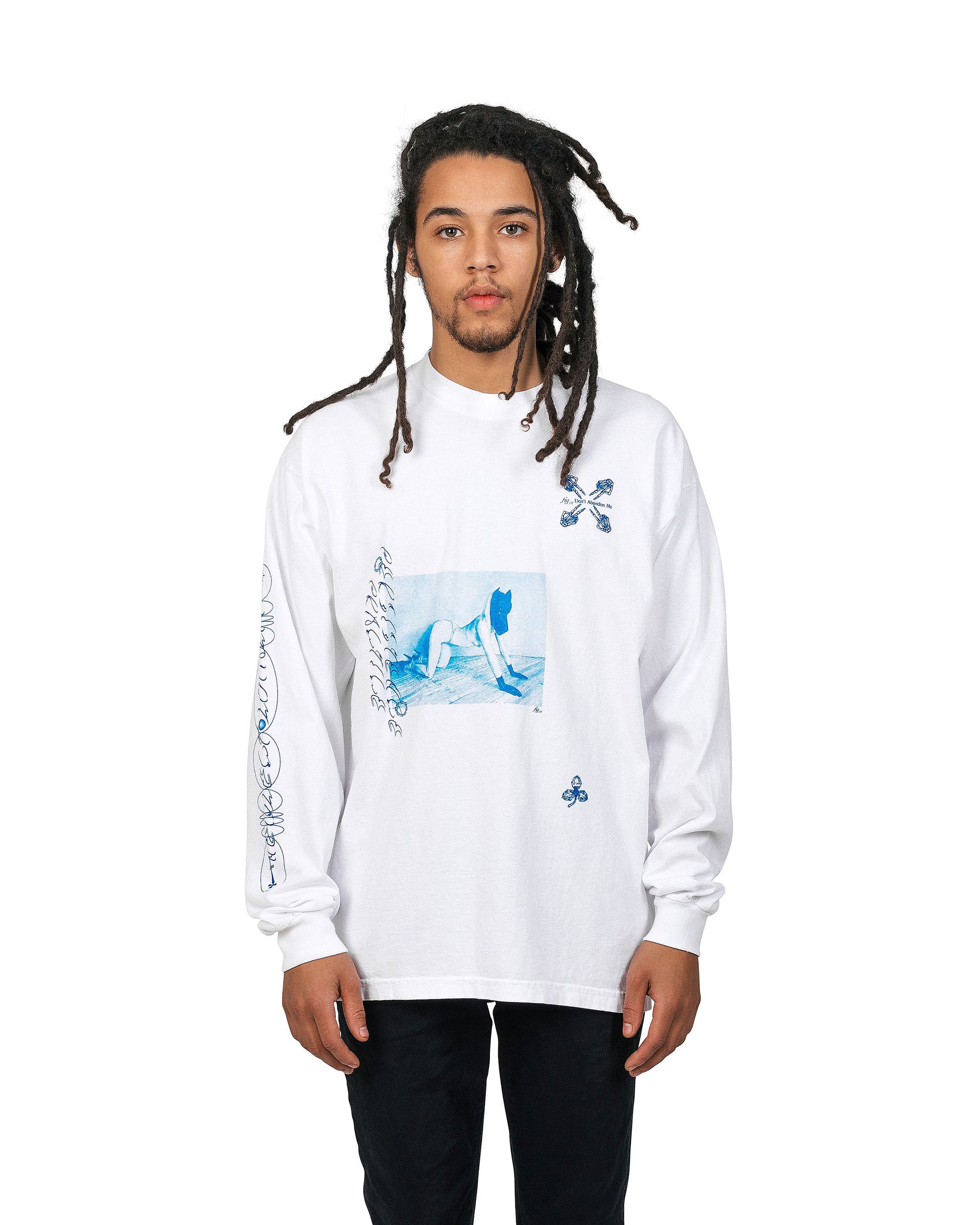 Medium weight longsleeve white cotton t-shirt with collaborative Noelia Towers front print and back graphic.