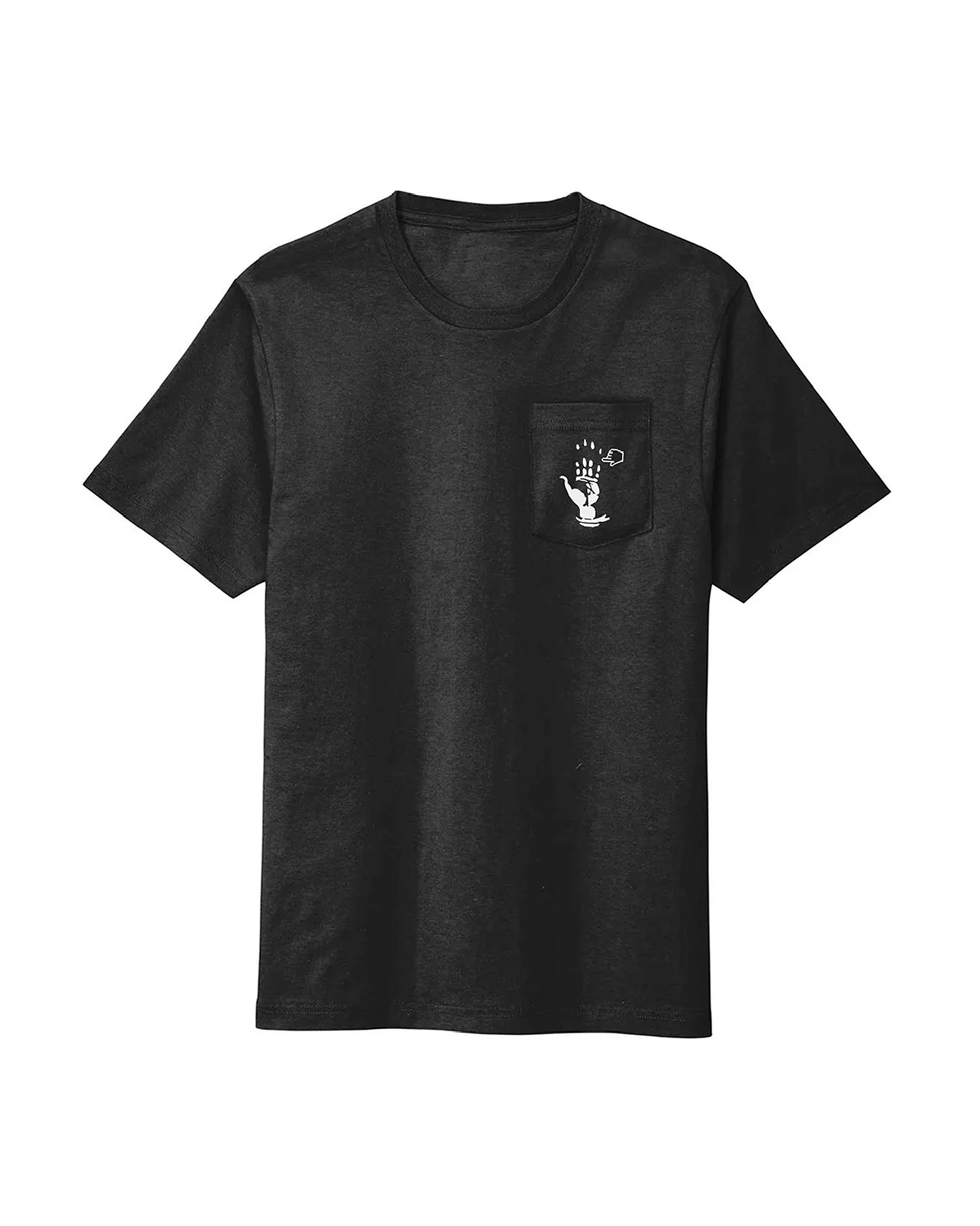 Heavy cotton unisex t-shirt in black with front pocket detail and one color front and back graphics and inner woven garment tag.